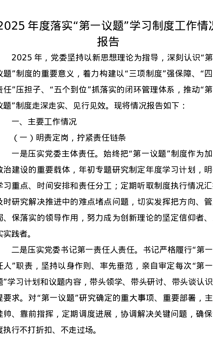 2025年度落实第一议题学习制度工作情况报告