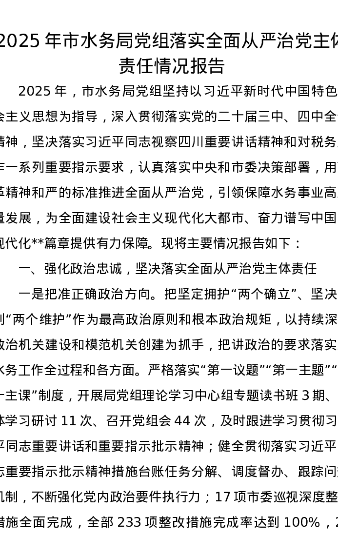 2025年市水务局党组落实全面从严治党主体责任情况报告