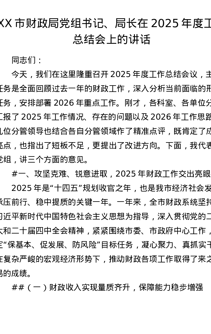 XX市财政局党组书记、局长在2025年度工作总结会上的讲话(8236字)