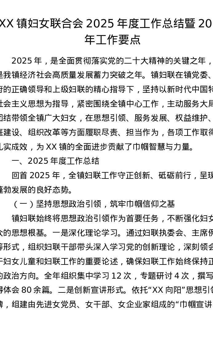 XX镇妇女联合会2025年度工作总结暨2026年工作要点
