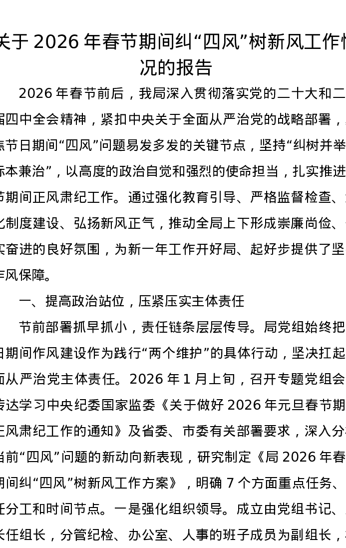 关于2026年春节期间纠四风树新风工作情况的报告