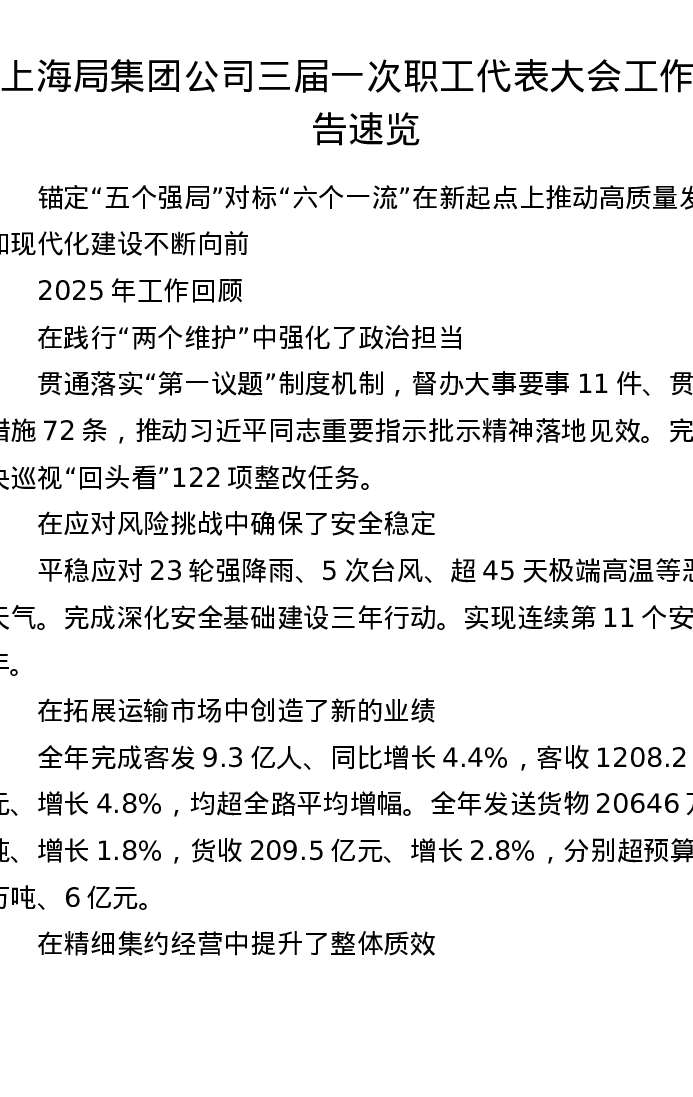 上海局集团公司三届一次职工代表大会工作报告速览