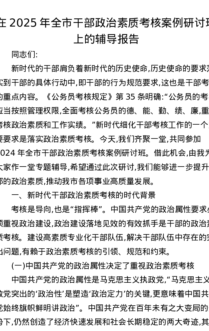 在2025年全市干部政治素质考核案例研讨班上的辅导报告