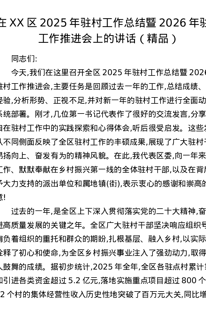在XX区2025年驻村工作总结暨2026年驻村工作推进会上的讲话
