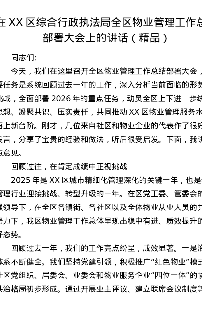 在XX区综合行政执法局全区物业管理工作总结部署大会上的讲话