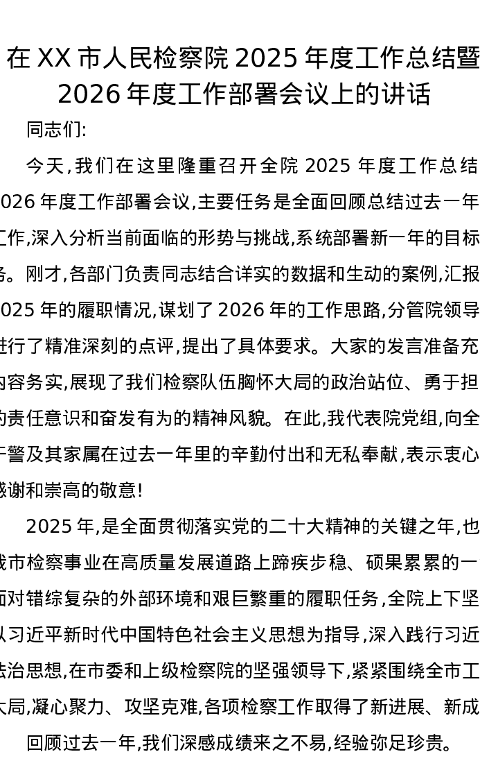 在XX市人民检察院2025年度工作总结暨2026年度工作部署会议上的讲话