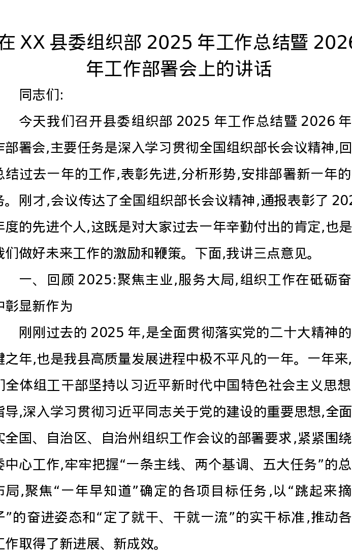 在XX县委组织部2025年工作总结暨2026年工作部署会上的讲话