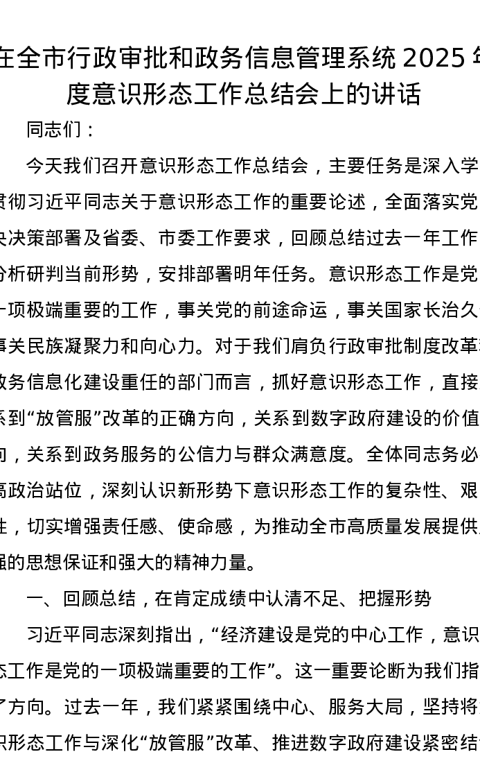 在全市行政审批和政务信息管理系统2025年度意识形态工作总结会上的讲话