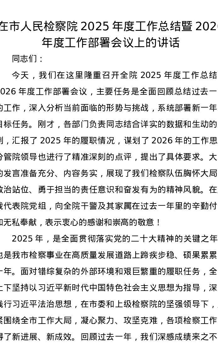 在市人民检察院2025年度工作总结暨2026年度工作部署会议上的讲话