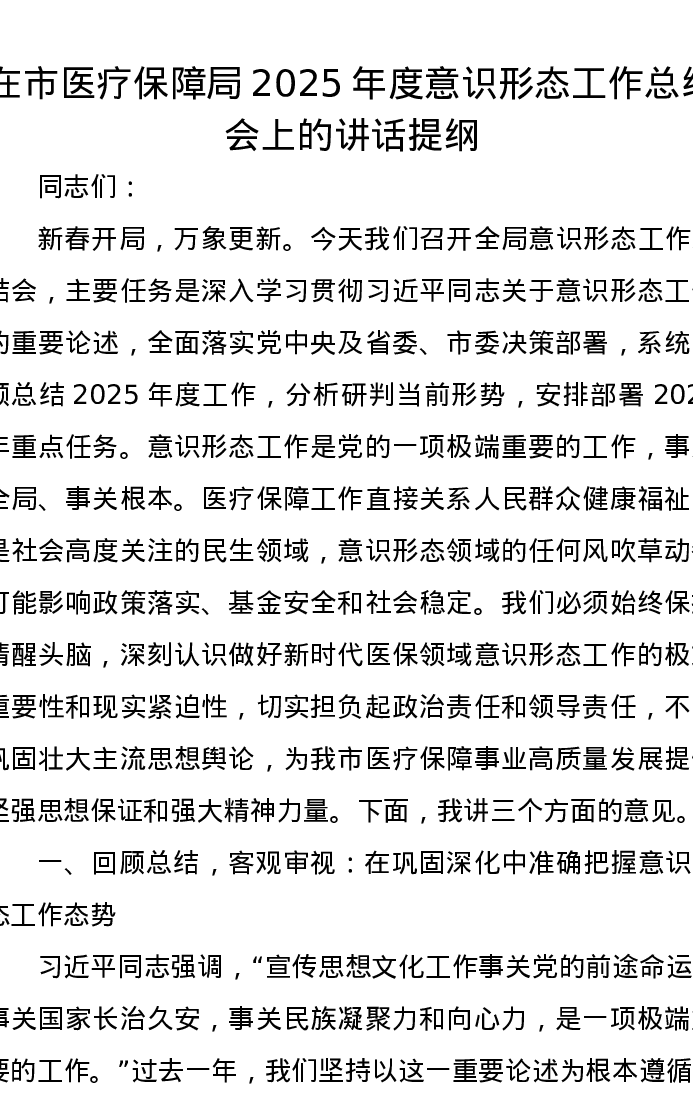 在市医疗保障局2025年度意识形态工作总结会上的讲话提纲