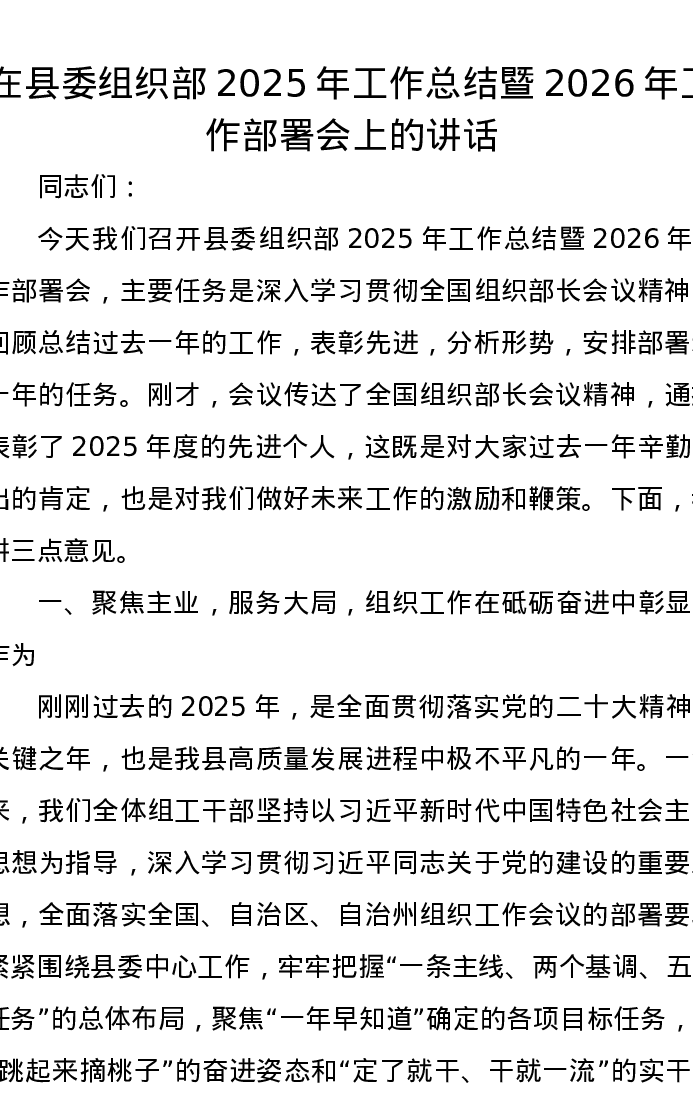 在县委组织部2025年工作总结暨2026年工作部署会上的讲话