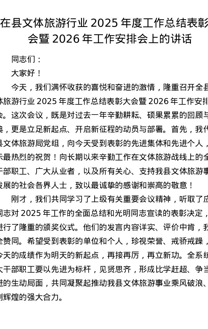 在县文体旅游行业2025年度工作总结表彰大会暨2026年工作安排会上的讲话