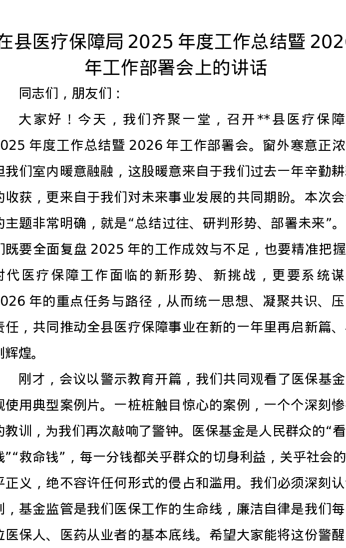 在县医疗保障局2025年度工作总结暨2026年工作部署会上的讲话