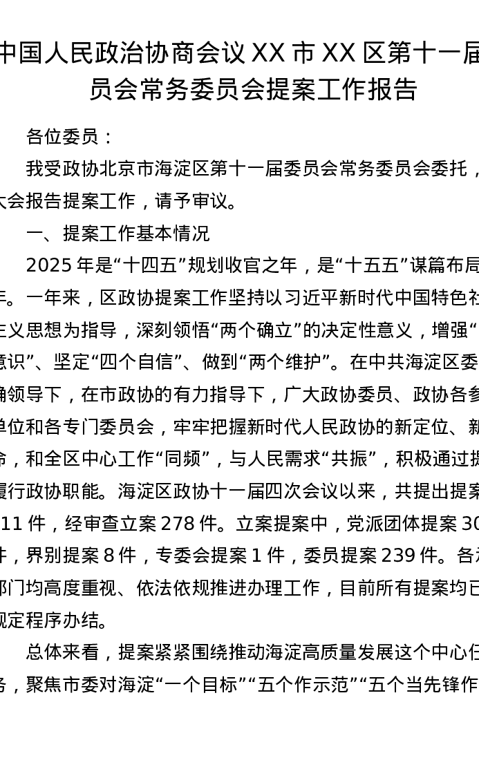 中国人民政治协商会议XX市XX区第十一届委员会常务委员会提案工作报告