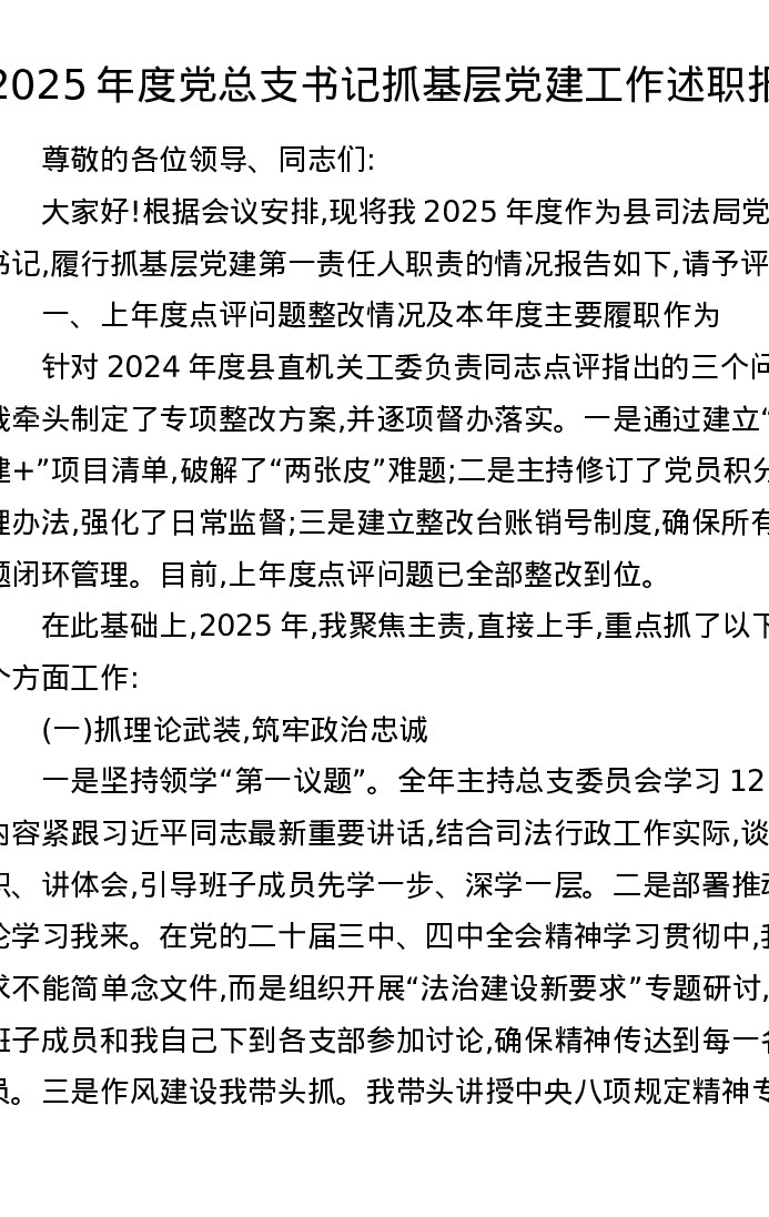 2025年度党总支书记抓基层党建工作述职报告