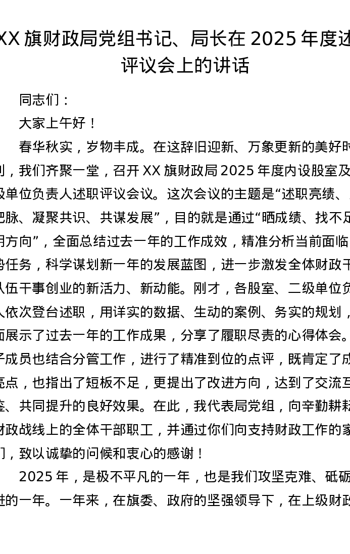 XX旗财政局党组书记、局长在2025年度述职评议会上的讲话(5215字)