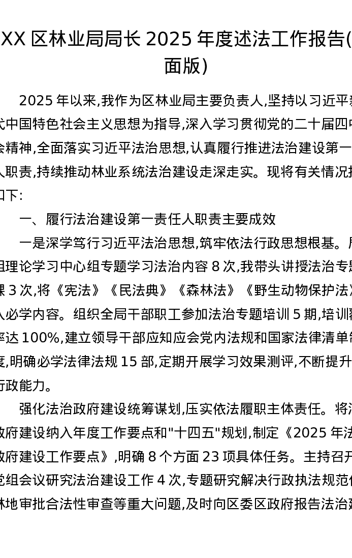 XX区林业局局长2025年度述法工作报告(书面版)