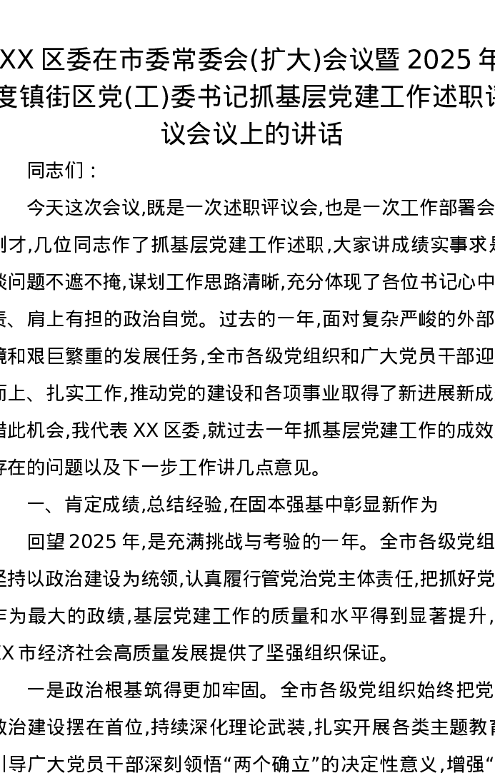 XX区委在市委常委会(扩大)会议暨2025年度镇街区党(工)委书记抓基层党建工作述职评议会议上的讲话
