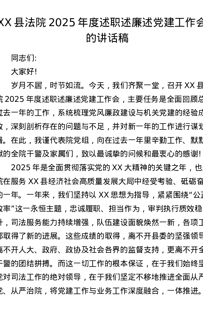XX县法院2025年度述职述廉述党建工作会上的讲话稿