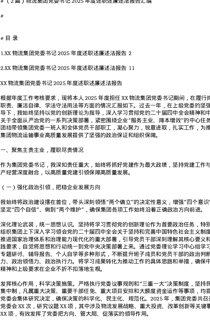 汇编:物流集团党委书记2025年度述职述廉述法报告2篇