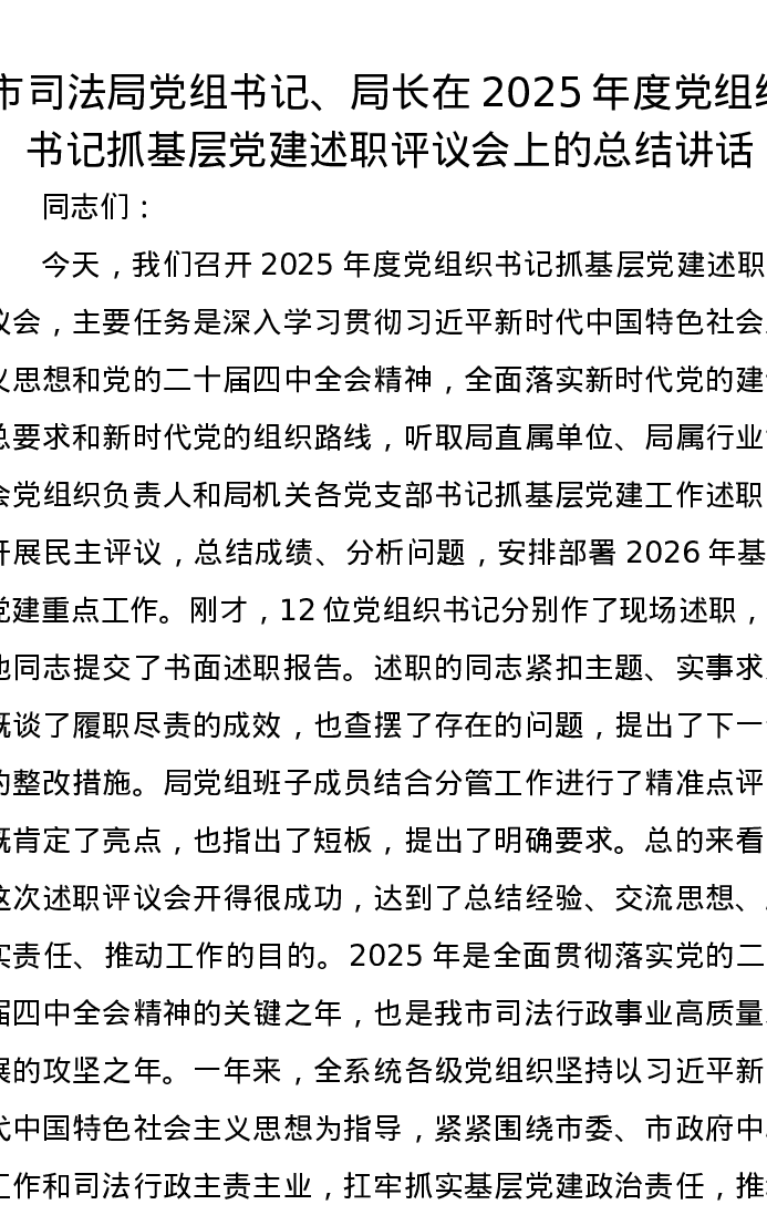 市司法局党组书记、局长在2025年度党组织书记抓基层党建述职评议会上的总结讲话