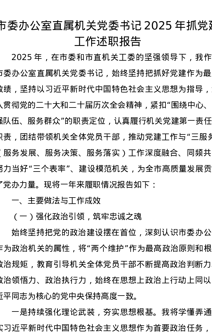 市委办公室直属机关党委书记2025年抓党建工作述职报告