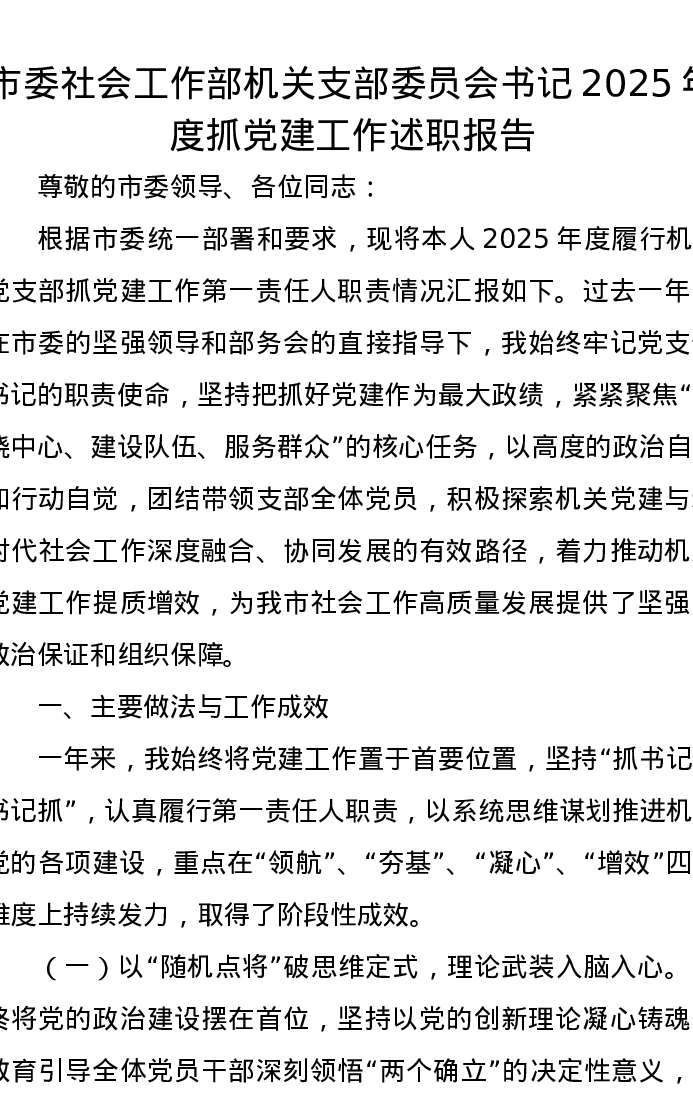 市委社会工作部机关支部委员会书记2025年度抓党建工作述职报告