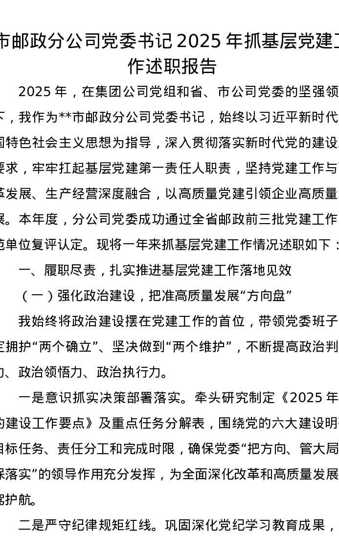 市邮政分公司党委书记2025年抓基层党建工作述职报告