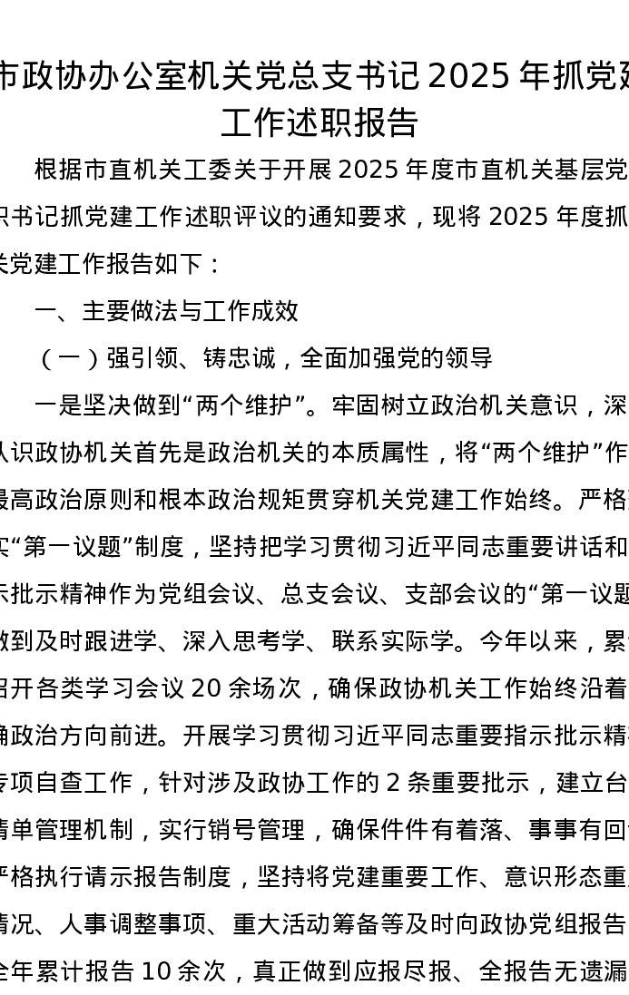 市政协办公室机关党总支书记 2025年抓党建工作述职报告