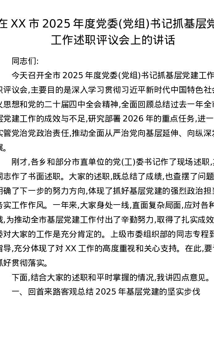 在XX市2025年度党委(党组)书记抓基层党建工作述职评议会上的讲话
