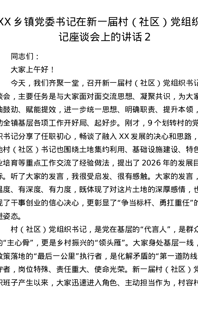 XX乡镇党委书记在新一届村(社区)党组织书记座谈会上的讲话2