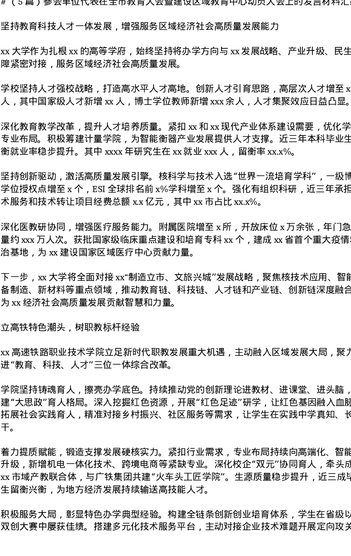 汇编:参会单位代表在全市教育大会暨建设区域教育中心动员大会上的发言5篇