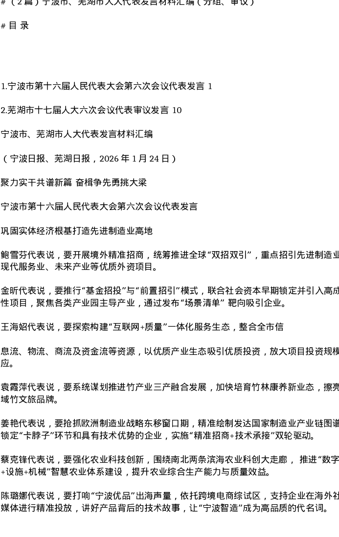 汇编:宁波市、芜湖市人大代表发言材料汇编(分组、审议)2篇