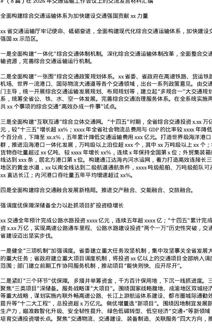 汇编:在2026年交通运输工作会议上的交流发言8篇