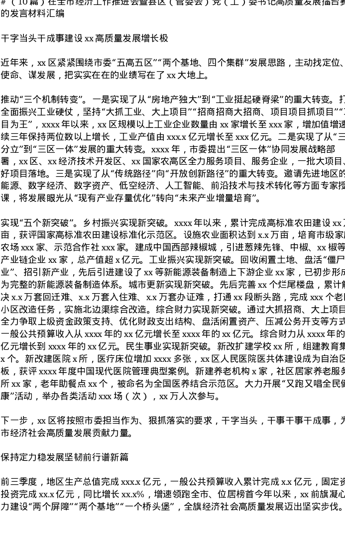 汇编:在全市经济工作推进会暨县区(管委会)党(工)委书记高质量发展擂台赛上的发言10篇