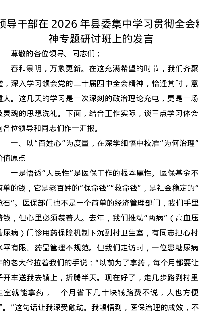 领导干部在2026年县委集中学习贯彻全会精神专题研讨班上的发言