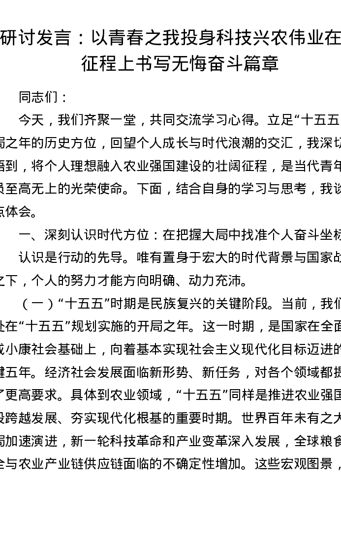 研讨发言:以青春之我投身科技兴农伟业在新征程上书写无悔奋斗篇章
