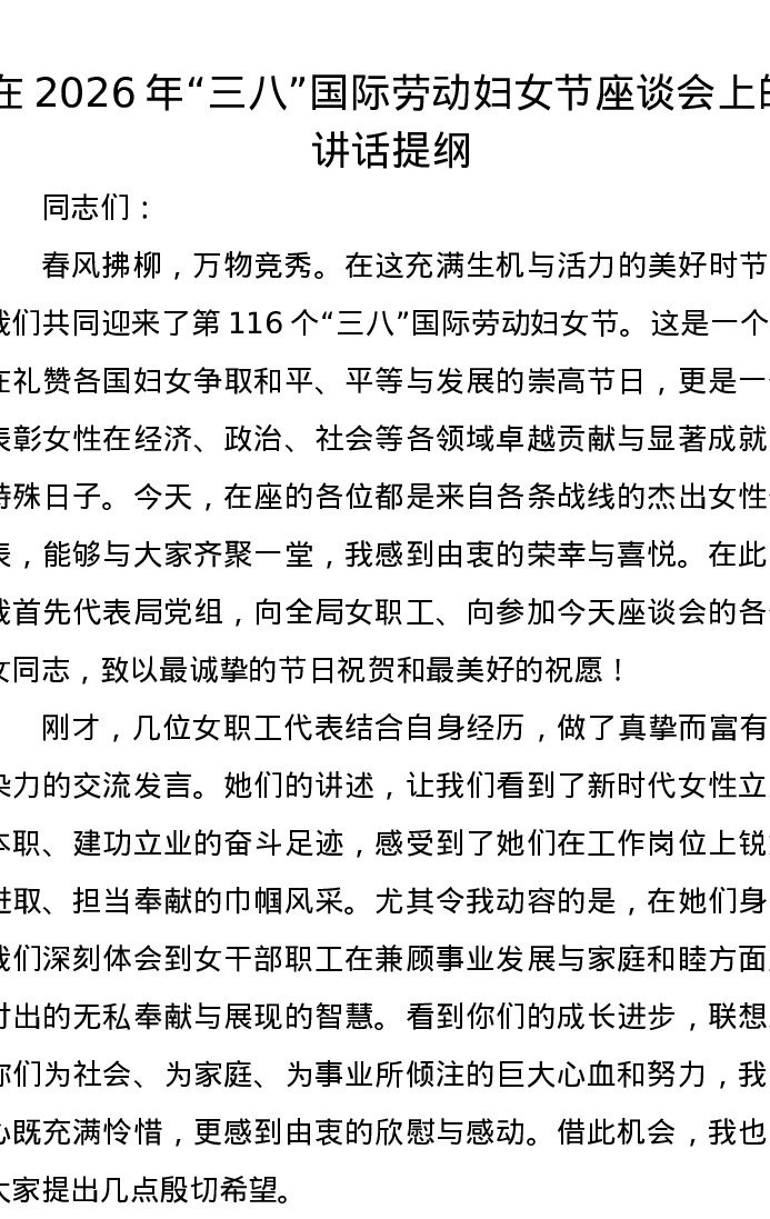 在2026年三八国际劳动妇女节座谈会上的讲话提纲