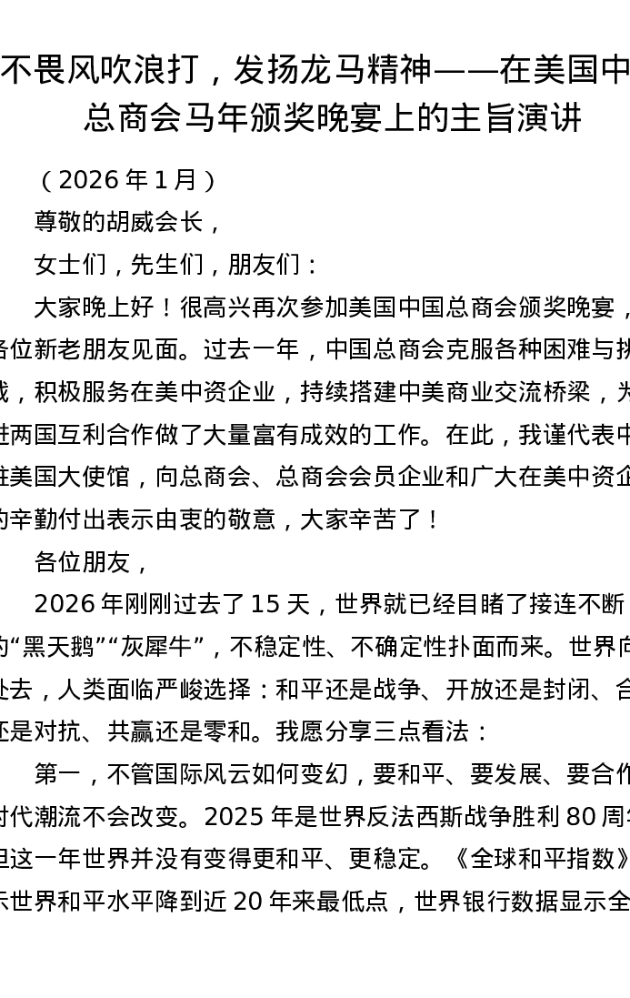 不畏风吹浪打,发扬龙马精神——在美国中国总商会马年颁奖晚宴上的主旨演讲