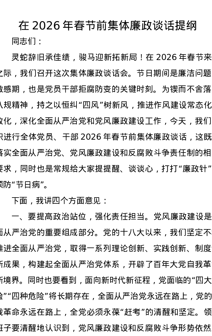 在2026年春节前集体廉政谈话提纲