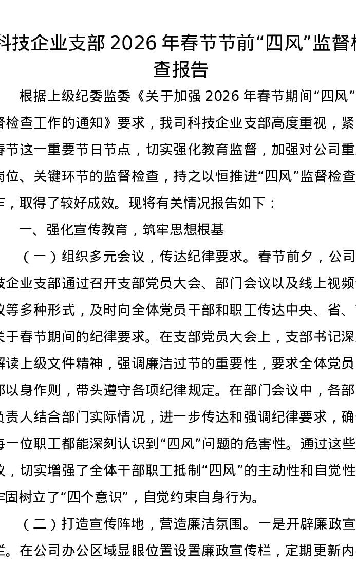 科技企业支部2026年春节节前四风监督检查报告