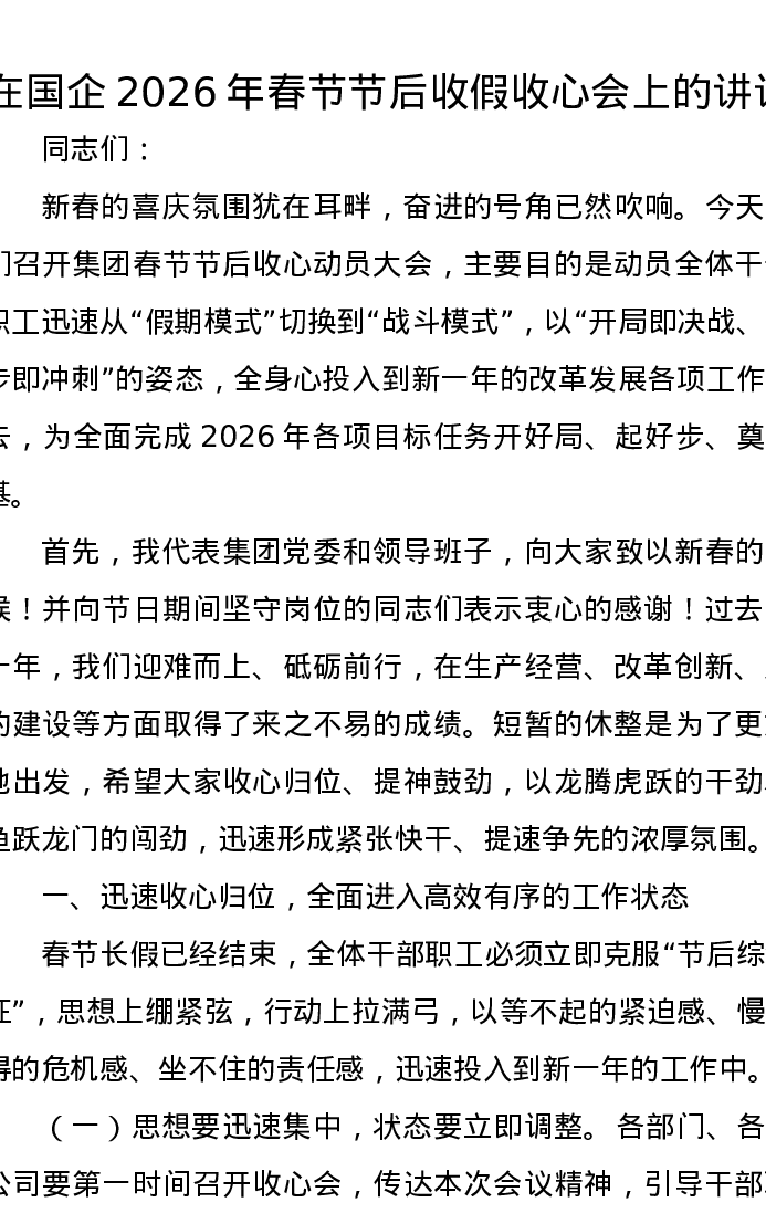 在国企2026年春节节后收假收心会上的讲话