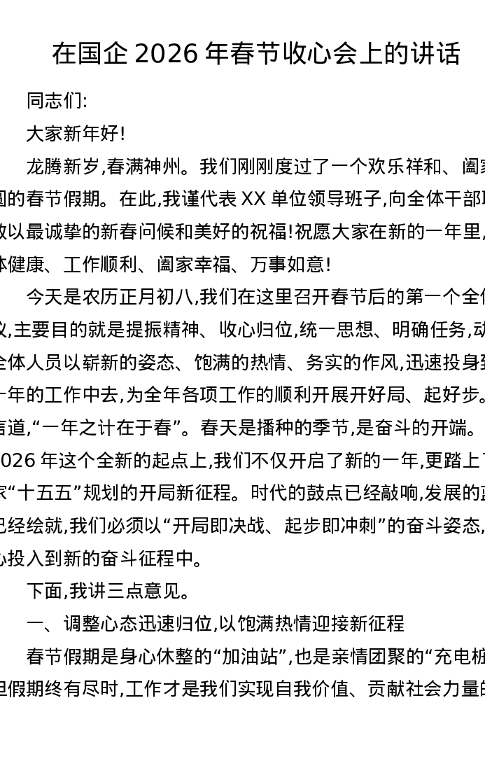 在国企2026年春节收心会上的讲话