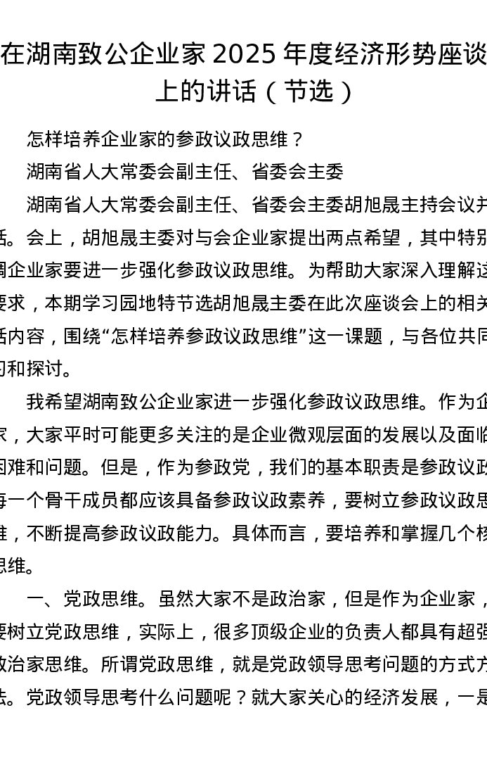 在湖南致公企业家2025年度经济形势座谈会上的讲话(节选)