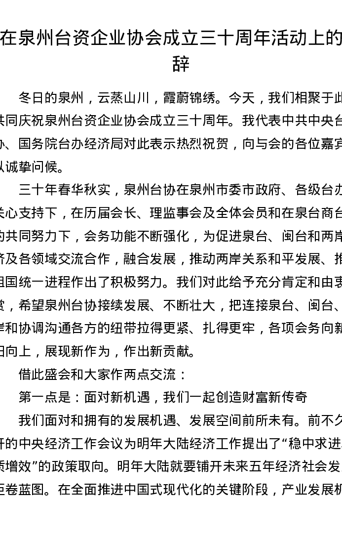在泉州台资企业协会成立三十周年活动上的致辞