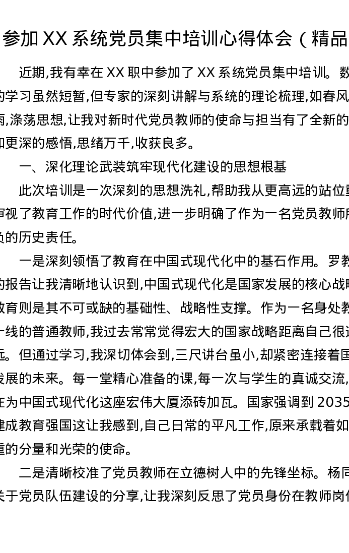 参加XX系统党员集中培训心得体会