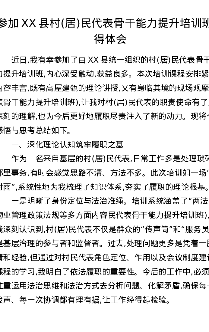 参加XX县村(居)民代表骨干能力提升培训班心得体会