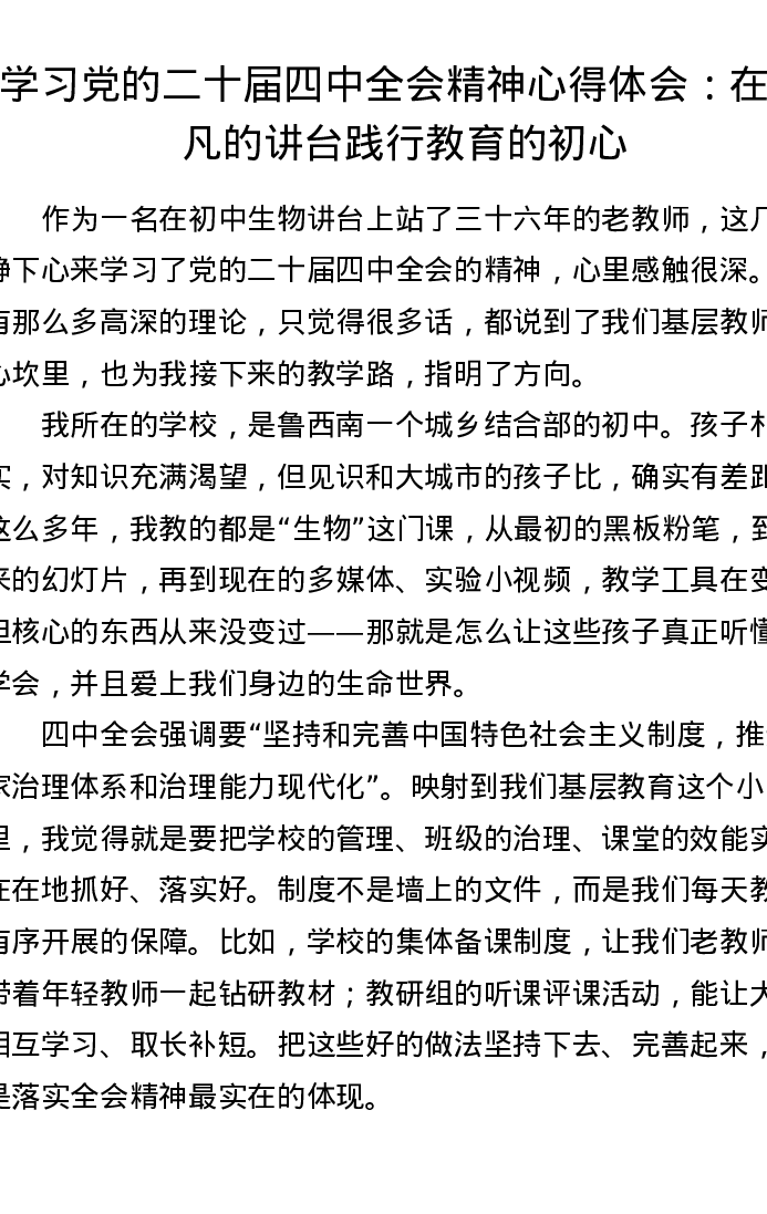 学习党的二十届四中全会精神心得体会:在平凡的讲台践行教育的初心