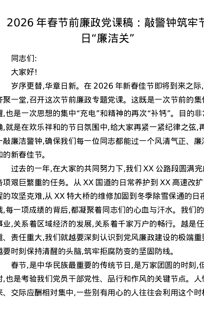 2026年春节前廉政党课稿:敲警钟筑牢节日廉洁关