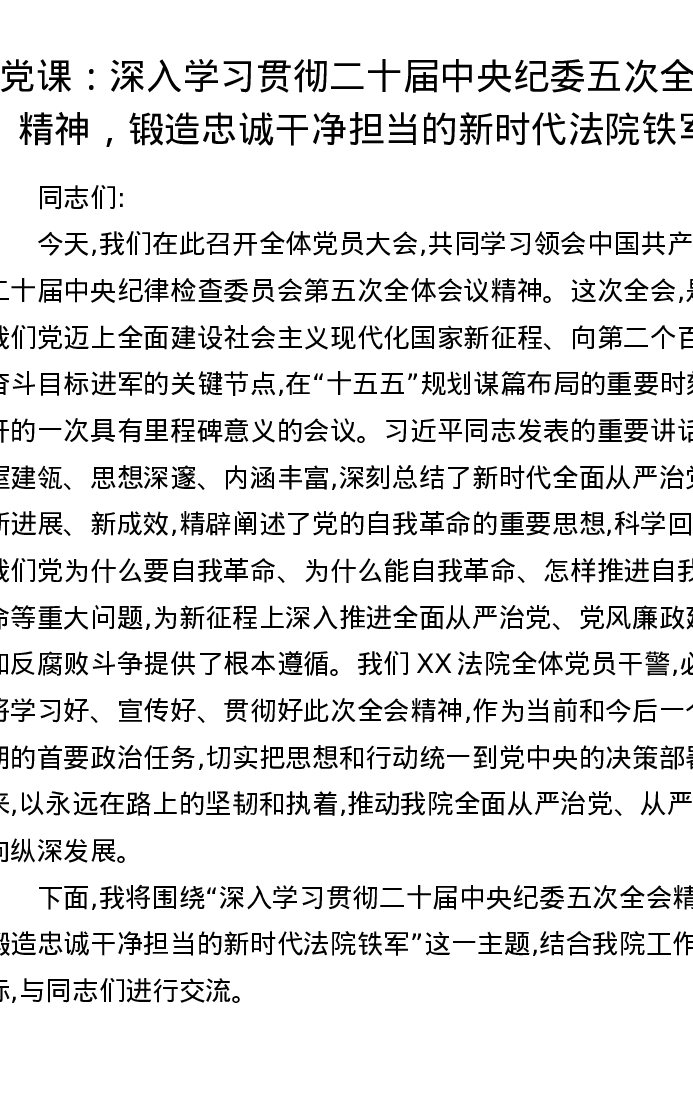 党课:深入学习贯彻二十届中央纪委五次全会精神,锻造忠诚干净担当的新时代法院铁军